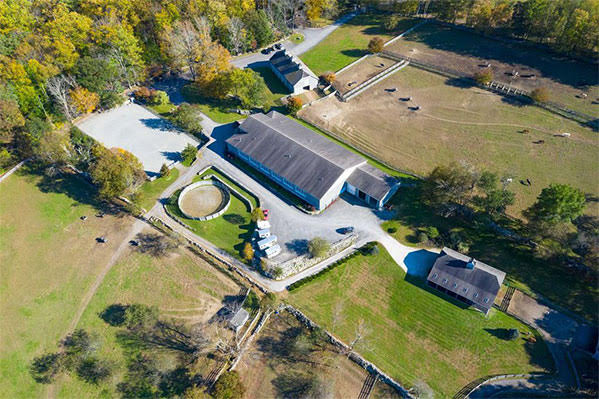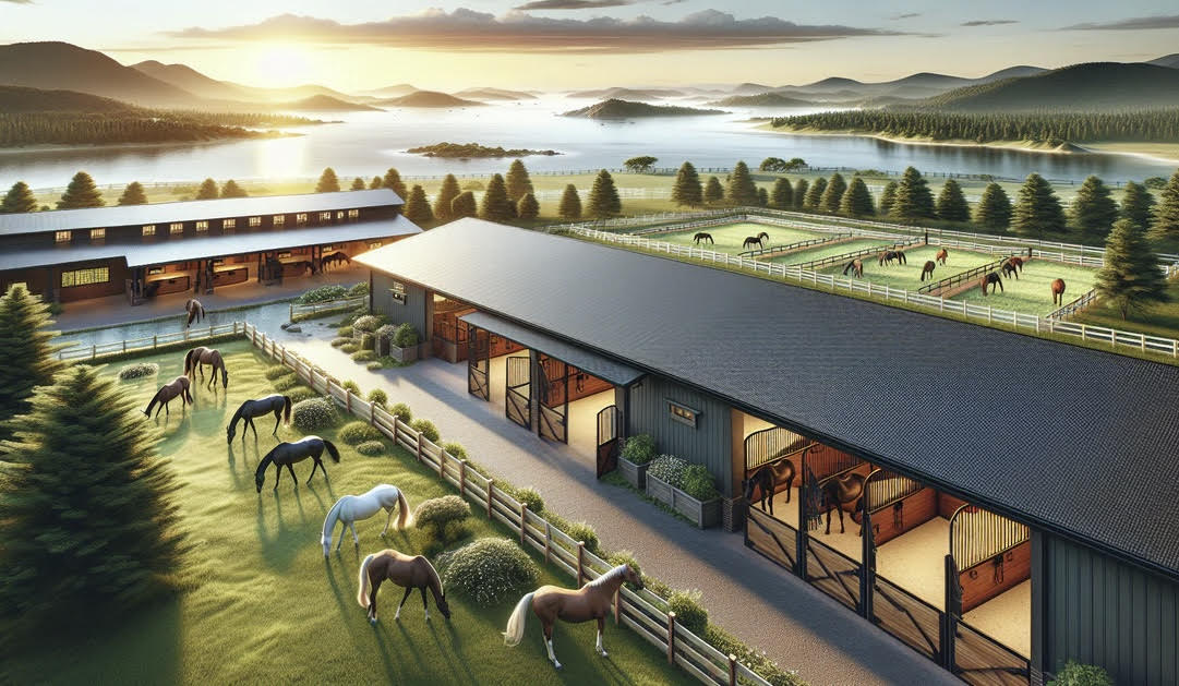The main barn concept with paddocks, feed storage, grooming stations, guest seating areas, and additional outbuildings